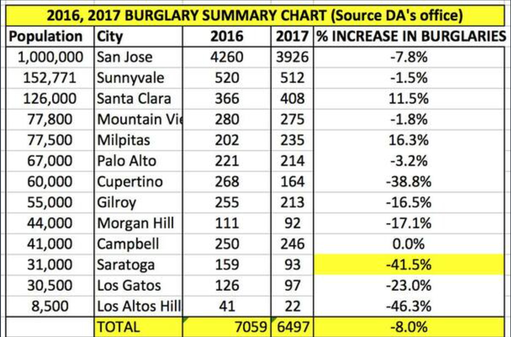 The Santa Clara County Sheriff’s Office has just published the latest crime data: From January to November 2023, there were 52 residential burglaries in Saratoga. Did you know that there were 130 home burglaries in 2016?